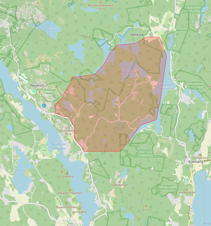 Kilpailualue on Espoon Nuuksion aluetta, joka muodostuu sekä kaupunkien ulkoilualueista että Nuuksion kansallispuiston alueista. Kilpailualue rajoittuu Velskolan eteläpuolelle ja Karjakaivon ja Kattilajärven ulkoilualueille. Kisamaastossa vaihtelevat pienpiirteiset hyväkulkuiset avokallioalueet, polku- ja tieverkosto sekä kuusikkoiset mäki- ja rinnealueet. Korkeuserot alueella ovat varsin jyrkkäpiirteiset ja yksittäiset mäet kohoavat 20–50 metrin korkuisiksi ympäristöstään. Kulkukelpoisuus on pääosin hyvä, mutta kaatuneet puut hidastavat paikoin kulkukelpoisuutta. Alueen vanhat kartat ovat vuodelta 2017.
